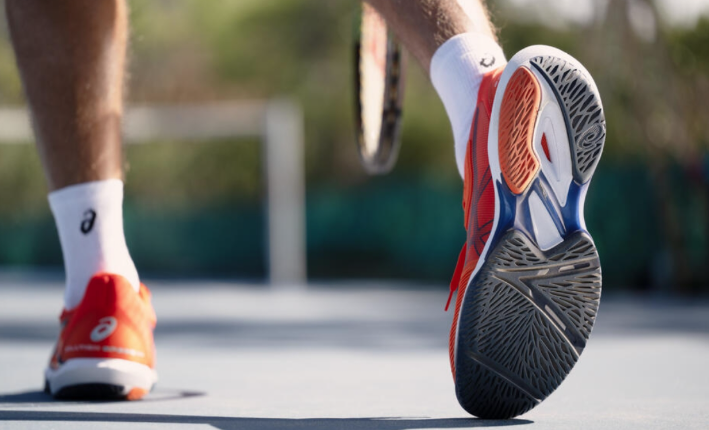 - Độ Bền & Hỗ Trợ: Giày tennis được làm bằng cao su siêu bền (chịu được sự mài mòn của sân cứng) và phần thân giày được gia cố cực kỳ chắc chắn để “khóa” chân bạn lại khi di chuyển ngang.