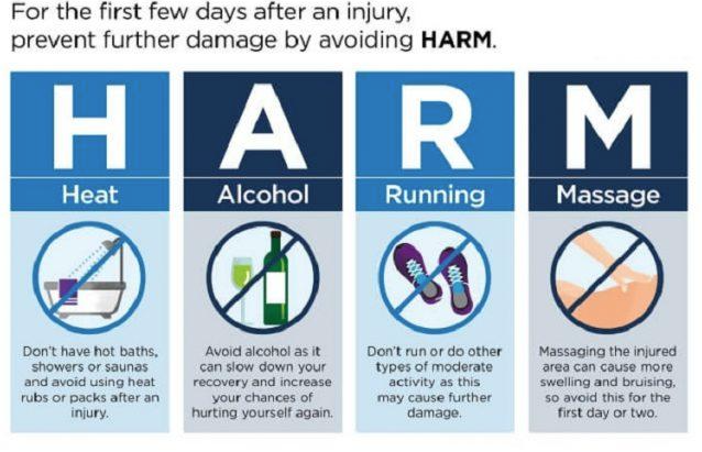 Những gì bạn KHÔNG NÊN làm cũng quan trọng như những gì bạn nên làm. Trong 2-3 ngày đầu sau chấn thương, hãy tránh xa các yếu tố H.A.R.M.: