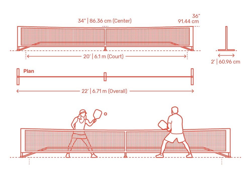 - Chiều cao: Lưới có chiều cao 36 inches (khoảng 91.44 cm) ở hai cột biên. Đặc biệt, nó hạ thấp xuống 34 inches (khoảng 86.36 cm) ở chính giữa sân.