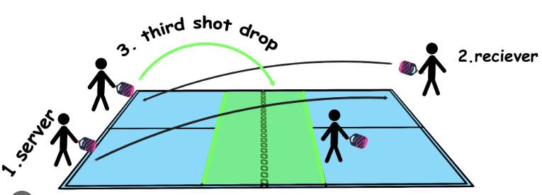 - Cách tính điểm: Chỉ có đội giao bóng (đội A) mới được ghi điểm, và họ chỉ ghi điểm NẾU họ thực hiện thành công cú third shot drop và thắng lượt bóng đó. Nếu họ đánh hỏng cú drop hoặc thua lượt bóng, họ sẽ mất quyền giao bóng.