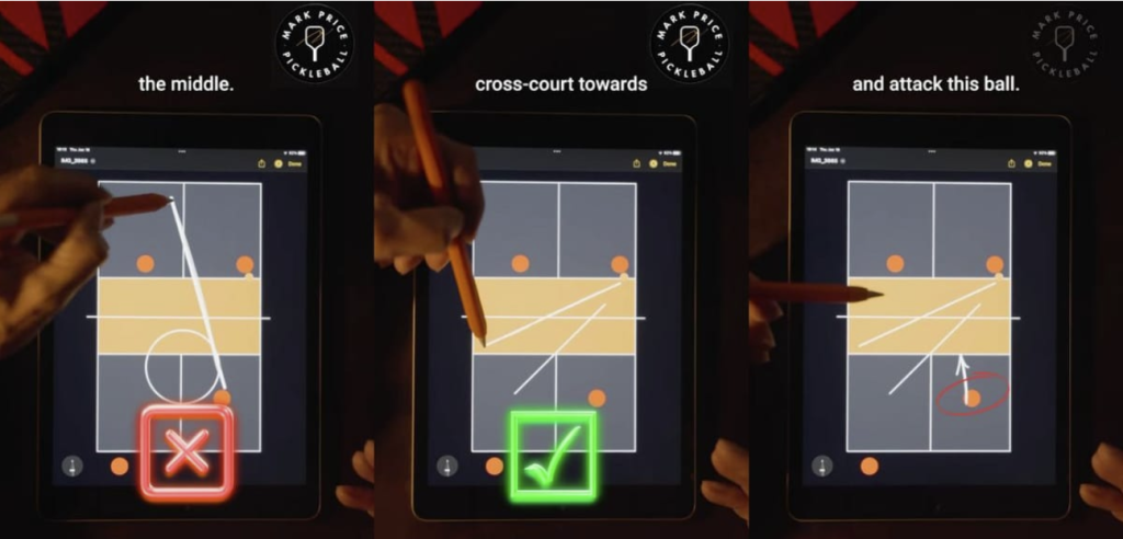 - Hành Động: Chấp nhận thực tế. Đừng cố gắng làm điều phi thường. Hãy thực hiện cú đánh an toàn nhất, rủi ro thấp nhất. Một cú dink chéo sân và nông (shallow cross-court dink).