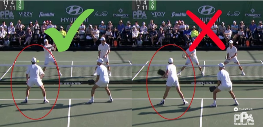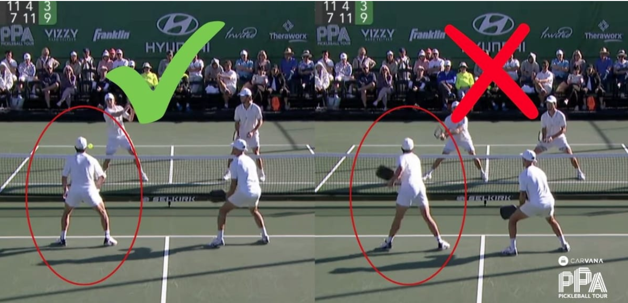 - Cú vung vợt gọn : Cú phản đòn nên là một cú đấm volley ngắn gọn, dứt khoát. Chủ yếu sử dụng vai và giữ cổ tay vững. Tránh những cú vung vợt lớn hoặc động tác kết thúc quá đà (follow through).