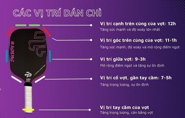 - Thay Đổi Sự Phân Bổ Trọng Lượng: Quan trọng không kém trọng lượng tổng thể là trọng lượng được đặt ở đâu. Việc dán băng chì vào các vị trí khác nhau sẽ thay đổi điểm cân bằng của vợt. Ảnh hưởng đến cảm giác vung (swing weight), tốc độ tay và sự ổn định.