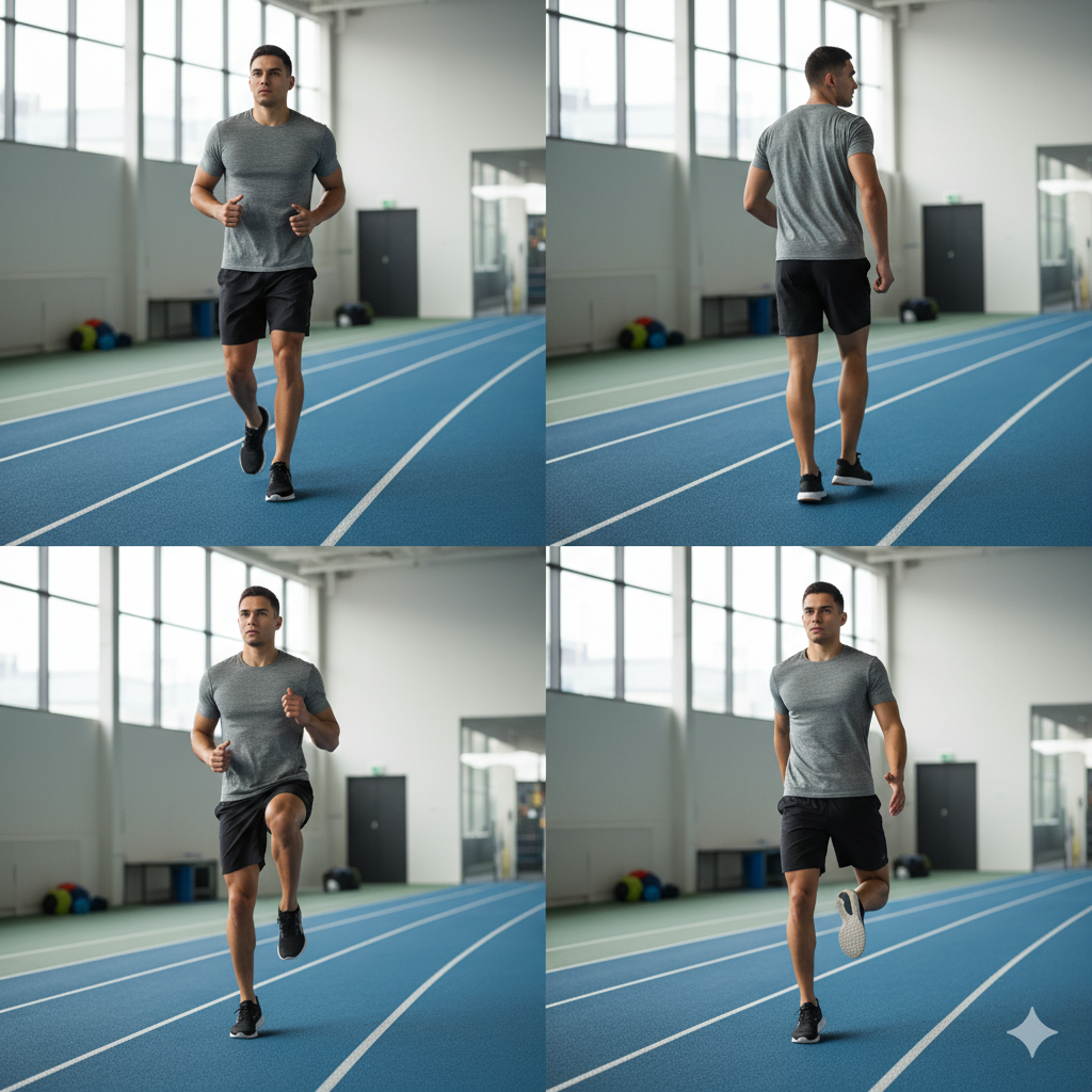 - Nâng cao gối / Đá gót chạm mông (High Knees/Butt Kicks): Tăng cường lưu thông máu, làm nóng cơ đùi trước và sau.